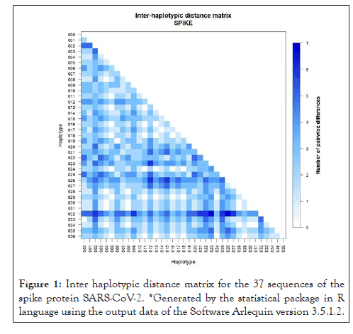 Figure 1: Inter haplotypic distance matrix for the 37 sequences of the spike protein SARS-CoV-2. *Generated by the statistical package in R language using the output data of the Software Arlequin version 3.5.1.2.