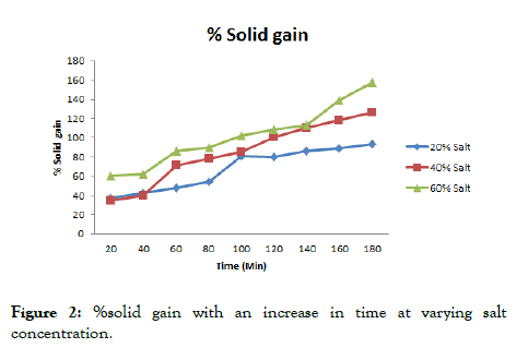 Figure 2: %solid gain with an increase in time at varying salt concentration.
