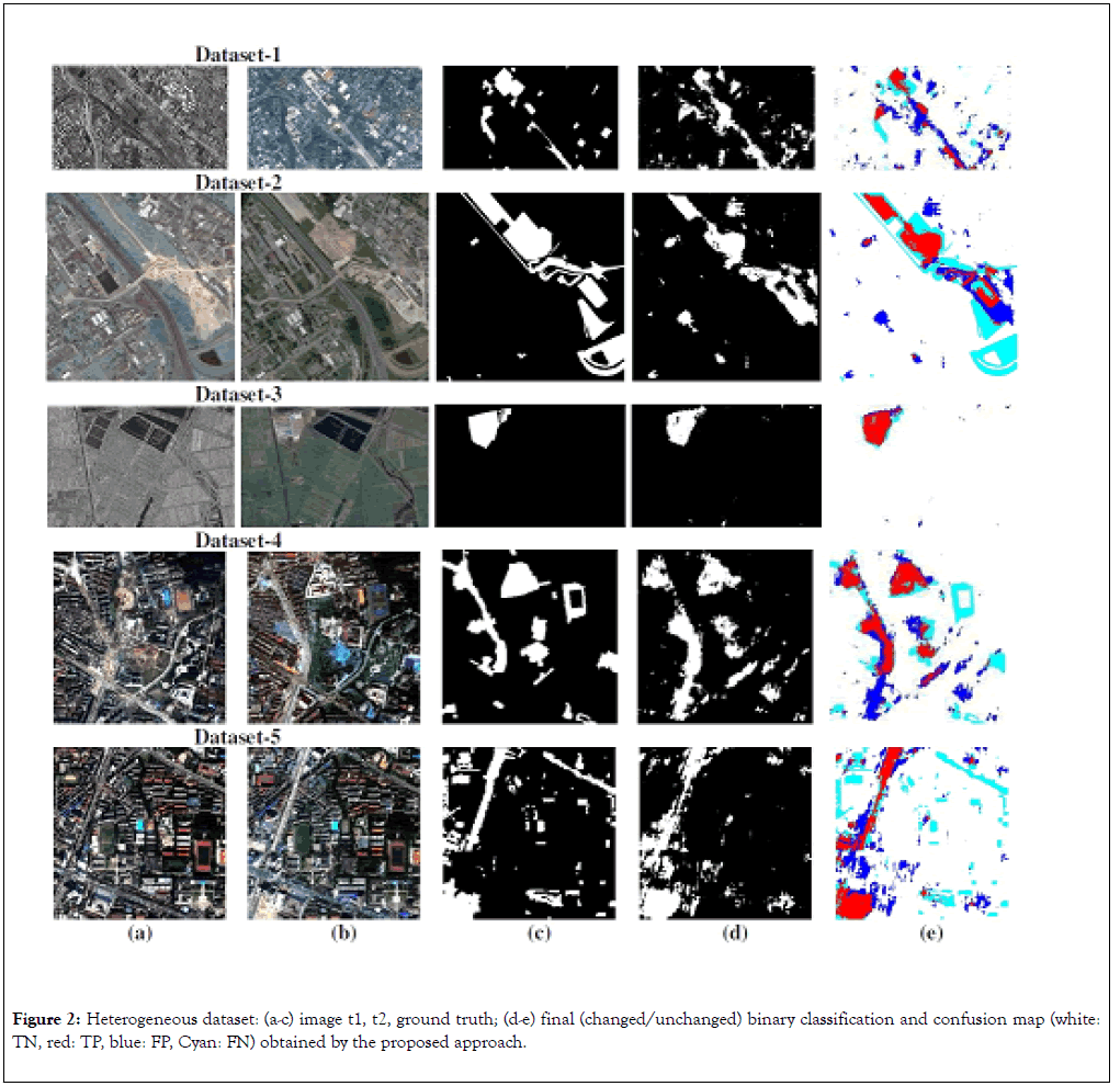 Figure 2. Heterogeneous dataset: (a-c) image t1, t2, ground truth; (d-e) final (changed/unchanged) binary classification and confusion map (white: TN, red: TP, blue: FP, Cyan: FN) obtained by the proposed approach.