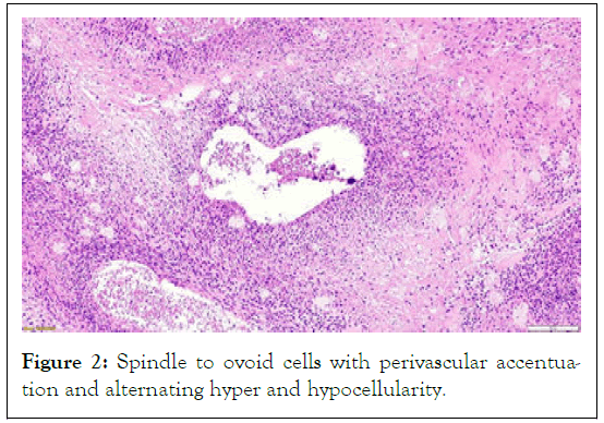 Figure 2: Spindle to ovoid cells with perivascular accentuation and alternating hyper and hypocellularity.