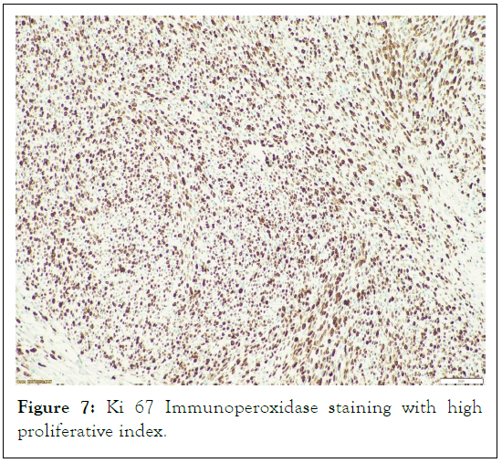 Heterologous elements such as rhabdomyosarcomatous areas, or epithelioid areas were not seen. In hotspot locations, the S100 and SOX 10 immunoperoxidase stains were found to be localized and patchy, while in the Ki 67 immunoperoxidase stain demonstrates a high proliferative index (Figures 5-7).