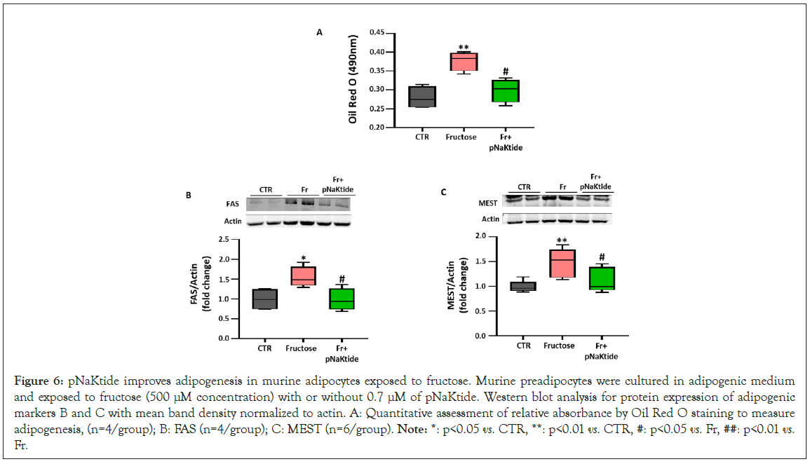 Figure 6: pNaKtide improves adipogenesis in murine adipocytes exposed to fructose. Murine preadipocytes were cultured in adipogenic medium and exposed to fructose (500 μM concentration) with or without 0.7 μM of pNaKtide. Western blot analysis for protein expression of adipogenic markers B and C with mean band density normalized to actin. A: Quantitative assessment of relative absorbance by Oil Red O staining to measure adipogenesis, (n=4/group); B: FAS (n=4/group); C: MEST (n=6/group). Note: *: p<0.05 vs. CTR, **: p<0.01 vs. CTR, #: p<0.05 vs. Fr, ##: p<0.01 vs. Fr.