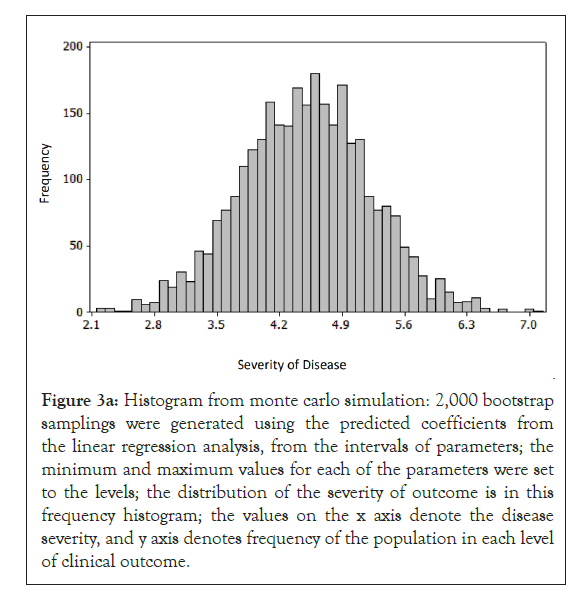 Figure 3a: Histogram from monte carlo simulation: 2,000 bootstrap samplings were generated using the predicted coefficients from the linear regression analysis, from the intervals of parameters; the minimum and maximum values for each of the parameters were set to the levels; the distribution of the severity of outcome is in this frequency histogram; the values on the x axis denote the disease severity, and y axis denotes frequency of the population in each level of clinical outcome.