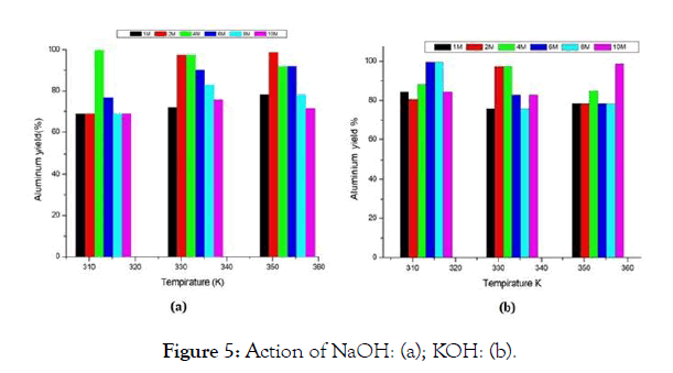 The generation of hydrogen gas causes the formation of [Al (OH)4]- (basic pH) in the solution, the mass of the starting aluminum is deduced by the experimental difference between m Pet-Al before reaction and m Pet at the end of the reaction. The equation of the reaction (2) allows us to establish a relationship in quantity of matter between released H2 and dissolved aluminum, the estimation of aluminum yield by the action of NaOH and KOH is illustrated in Figure 5. It can be said that the amount of aluminum that goes into solution is important for KOH and NaOH, except that for a 10M concentration the yield is not appreciable for NaOH relative to KOH.
