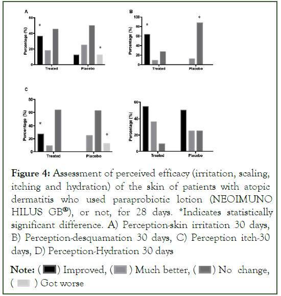 Figure 4: Assessment of perceived efficacy (irritation, scaling, itching and hydration) of the skin of patients with atopic dermatitis who used paraprobiotic lotion (NEOIMUNO HILUS GB®), or not, for 28 days. *Indicates statistically significant difference. A) Perception-skin irritation 30 days, B) Perception-desquamation 30 days, C) Perception itch-30 days, D) Perception-Hydration 30 days