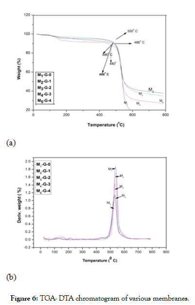 Thermal properties: Thermogravimetric analysis (TGA) and Differential Thermal Analysis (DTA) of the membranes prepared with Dendrimer (G-0, 1, 2, 3, 4) are shown in the Figure 6a and 6b. TGA DTA studies of the membranes were done under the atmosphere of N2 at a heating rate of 100°C min-1. The thermal decomposition curves of the membranes are shown in Figure 6a and the derivative curves of the membranes are shown in Figure 6b. From the TGA curves it was observed that all the membranes are stable up to a temperature of 480°C-500°C. Thus; it was observed from the TGA curves that all the membranes prepared by various generations of dendrimer possessed almost similar extent of thermal stabilities. From the DTA curves of the membranes it was observed that all the membranes possessed an exotherm which was obtained around 530°C-560°C.