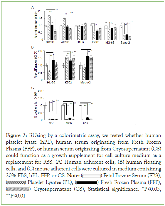 Results: We found that 1-hour incubation of FFP or CS with a physiological level of thrombin and alcium Chloride (CaCl2) depleted virtually all fibrinogen. Comparative proliferation studies with FBS and human Platelet Lysates (hPLs) showed that compared with FBS, FFP-serum exhibited similar or greater proliferative effects on 8 human cell lines: Bone Marrow-Derived Mesenchymal Stromal Cells (BMSC), Adipose Tissue-Derived Mesenchymal Stromal Cells (ADSC), HeLa, 293T, MG-63, HL-60, K562, and Meg-A2 except for Saos-2 cells, whereas CS-serum exhibited weaker proliferative effects on BMSC, ADSC and Saos-2 cells. hPL promoted the growth of BMSC and ADSC cells more vigorously than FFP- and CS-serum.