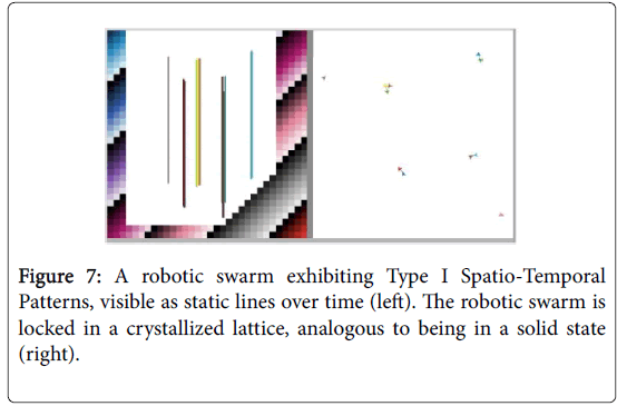 Results which confirm previous research The discovered patterns lend proof to the theory that computational mechanisms govern the intelligent, self-coordinating, emergent behaviors in swarms of simple, reactive robots (similar to how they govern the emergent behavior in Cellular Automata). The majority of our findings were in line with previous research findings related to spatiotemporal patterns (in Cellular Automata), including: There are many different spatiotemporal patterns (i.e., different spatial configurations perpetuating over time) [10,19]. Each pattern represent a separate piece of information encoded into the system [10,19]. The perpetuation of spatio-temporal patterns allow for pieces of information to be stored, like a memory. Data is stored so long as the patterns persist while remaining unchanged [10,19,39]. Moving spatio-temporal patterns (i.e., not those remaining stationary but those which change spatial coordinates over time) transfer pieces of information across the system [10,19,24]. Changing a spatiotemporal pattern corresponds to changing the associated piece of information [10,19]. A number of Stable types of Spatio-Temporal Patterns were identified [10]. Some unstable (semi-stable) spatio-temporal patterns also exist [10] Stable Spatio-Temporal Patterns can change if influenced by an external event (i.e., collisions with other spatio-temporal patterns) [5,10,18,51]. Unstable (Semi-stable) Spatio-Temporal Patterns can spontaneously change pattern or velocity without any external influences [10].