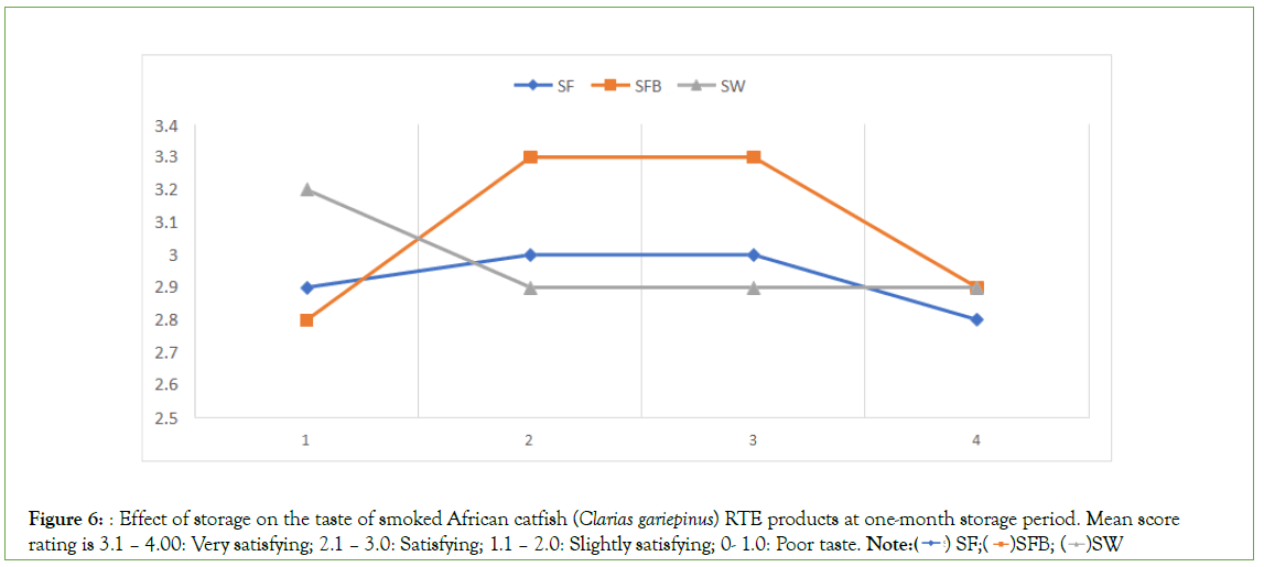 Figure 6: Effect of storage on the taste of smoked African catfish (Clarias gariepinus) RTE products at one-month storage period. Mean score
