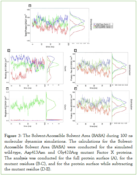 Figure 7: The Solvent-Accessible Solvent Area (SASA) during 100 ns molecular dynamics simulations. The calculations for the Solvent- Accessible Solvent Area (SASA) were conducted for the simulated wild-type, Asp413Asn and Gly420Arg mutant Factor X proteins. The analysis was conducted for the full protein surface (A), for the mutant residues (B-C), and for the protein surface while subtracting the mutant residue (D-E).
