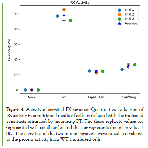 Figure 4: Activity of secreted FX variants. Quantitative evaluation of FX activity in conditioned media of cells transfected with the indicated constructs estimated by measuring PT. The three replicate values are represented with small circles and the star represents the mean value± SD. The activities of the two mutant proteins were calculated relative to the protein activity from WT transfected cells.