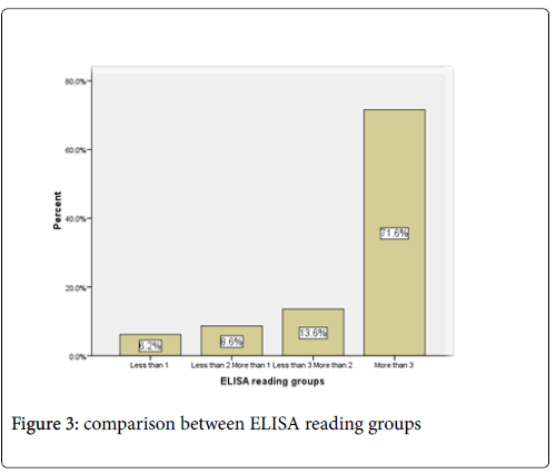 The mean of ELISA reading in the males (2.7005) was higher than female (2.668) (Figure 2). Out of 80 positive samples there were 76.1%, 13.6 %, 8.6% and 6.2% show ELISA reading above 3, less than 3 more than 2, less than 2 more than 1 and less than 1 respectively. (Figure 3).