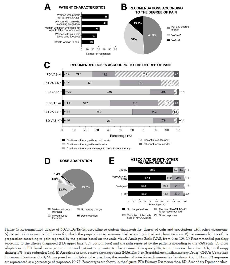 Figure 1: Recommended dosage of NAC/LA/Br/Zn according to patient characteristics, degree of pain and associations with other treatments. A) Expert opinion on the indication for which the preparation is recommended according to patient characteristics. B) Recommendations of the preparation according to pain reported by the patient based on the scale Visual Analogue Scale (VAS, from 0 to 10). C) Recommended posology according to the disease diagnosed (PD: upper bars; SD: bottom bars) and the pain reported by the patients according to the VAS scale. D) Dose adaptation in PD based on expert opinion and patient comments; to discontinued therapies 79%; to continuous therapies 14%; no therapy changes 5%; dose reduction 1%). E) Associations with other pharmaceuticals (NSAIDs: Non-Steroidal Anti-Inflammatory Drugs; CHCs: Combined Hormonal Contraception); *A was posed as multiple-choice questions; the number of votes for each answer is after shown (B, C, D and E) responses are represented as a percentage of responses, N=73. Percentages are shown in the figures; PD: Primary Dysmenorrhea. SD: Secondary Dysmenorrhea.