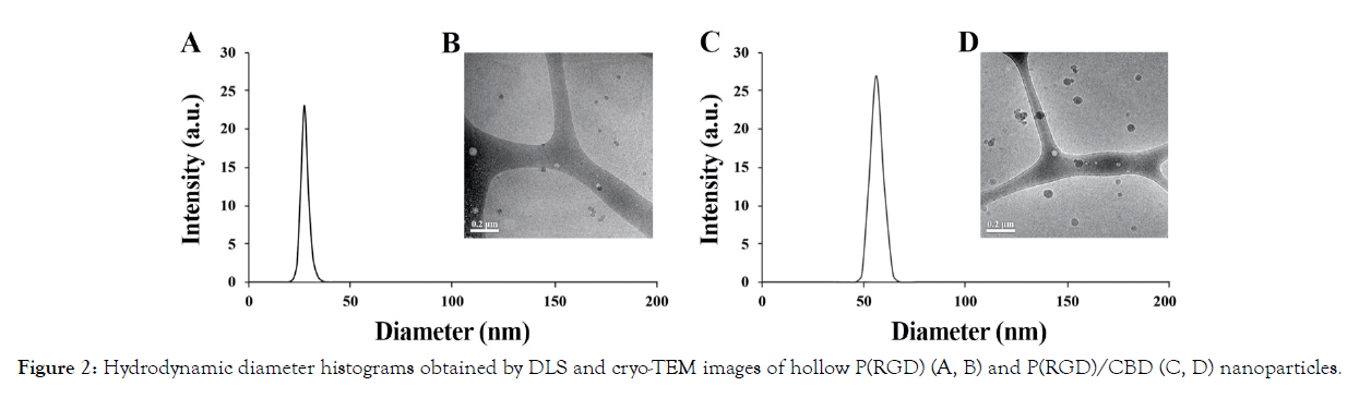 As previously mentioned, proteinoids self-assemble into particles in an aqueous solution. Hollow and CBD-loaded P(RGD) particles were obtained according to the procedure in the experimental part. The obtained particles were evaluated in terms of size, SD, DL and ζ-potential, see Table 2. The diameters of the hollow and CBD-loaded P(RGD) dispersed in aqueous continuous phase were analyzed by DLS and cryo-TEM, as shown is Figure 2. As expected, the diameter of the P(RGD)/CBD NPs was larger than of the hollow ones, in accord with CBD entrapment. Both P(RGD) and P(RGD)/CBD (10% w/w), exhibited populations of uniform spherical population with diameters less than 100 nm, which are typical range of NPs. Hollow P(RGD) NPs yielded hydrodynamic diameters of 34 ± 3 nm with a SD of 9%, while P(RGD)/CBD NPs had significantly larger diameters of 62 ± 5 nm with similar SD of 8%, presented by DLS histograms (Figure 2 and Table 2). Cryo- TEM microscopy demonstrated very similar particle diameters of 30 ± 2 nm with a SD of 7% and 59 ± 6 nm with a SD of 10% for hollow and CBD-loaded NPs, respectively.