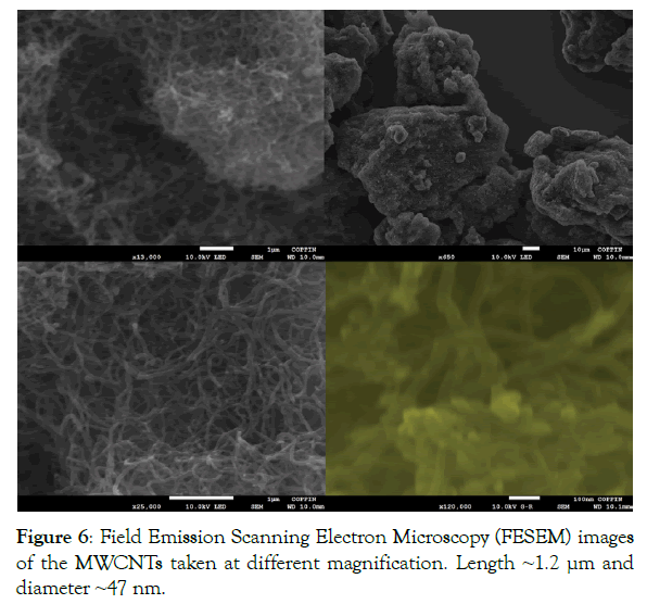 The sample was characterized via Field Emission Scanning Electron Microscopy (FESEM) imaging. The measurement was carried out to determine the length and diameter of the multiwalled carbon nanotubes, and to observe the porosity and morphology of the sample. FESEM images of the samples at different magnifications are displayed in Figure 6. The average length of the MWCNTs was determined to be 1.2 μm and the diameter average out at 57 nm.