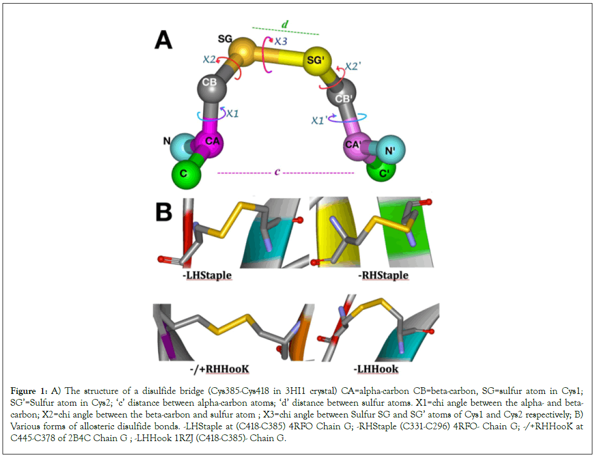 Figure 1: A) The structure of a disulfide bridge (Cys385-Cys418 in 3HI1 crystal) CA=alpha-carbon CB=beta-carbon, SG=sulfur atom in Cys1; SG’=Sulfur atom in Cys2; ‘c’ distance between alpha-carbon atoms; ‘d’ distance between sulfur atoms. X1=chi angle between the alpha- and beta- carbon; X2=chi angle between the beta-carbon and sulfur atom ; X3=chi angle between Sulfur SG and SG’ atoms of Cys1 and Cys2 respectively; B) Various forms of allosteric disulfide bonds. -LHStaple at (C418-C385) 4RFO Chain G; -RHStaple (C331-C296) 4RFO- Chain G; -/+RHHooK at C445-C378 of 2B4C Chain G ; -LHHook 1RZJ (C418-C385)- Chain G.