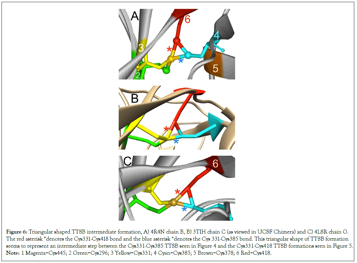 The TTSB formations observed in this study mostly occur as Cys331-Cys385; but in Chains G of 1YYL, 1YYM crystals, chain G of 4LSR and chain I of 4R4N, it exists as Cys331-Cys418. Whereas in Crystal 3TIH chain C, 4R4N chain G, 4LSR chain G, it exists as both Cys331-Cys385 and Cys331-Cys418 (Figures 4 and 5).