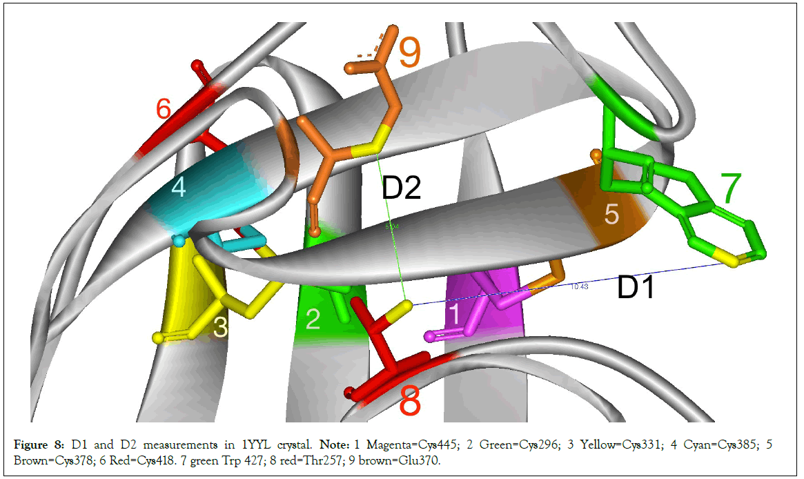 Figure 8: D1 and D2 measurements in 1YYL crystal. Note: 1 Magenta=Cys445; 2 Green=Cys296; 3 Yellow=Cys331; 4 Cyan=Cys385; 5 Brown=Cys378; 6 Red=Cys418. 7 green Trp 427; 8 red=Thr257; 9 brown=Glu370.