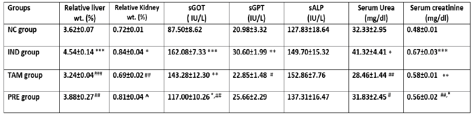 IND-treated group showed a significant increase in relative liver and kidney weights, sGOT (P<0.0001), sGPT (P<0.001) but not sALP, serum urea and serum creatinine were also significantly elevated compared to negative control. TAM-treated group showed significant increase in sGOT and serum creatinine compared to control group (P<0.001). In this group, the relative liver and kidney weights are significantly lower than IND group (P<0.001, P<0.01 respectively). sGOT and serum creatinine were significantly higher than control group (P<0.01). Pretreatment of rats with TAM before the induction of hepato-renal toxicity by IND resulted in significant reduction in relative liver weight, sGOT, serum urea and serum creatinine (P<0.01) as compared to IND group.