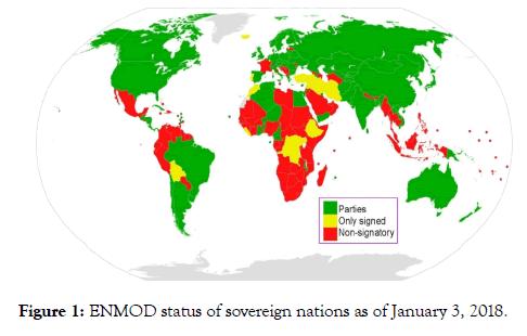 Accordingly, the United Nations garnered appropriate support and produced a treaty document, originally classified as disarmament, entitled “ Convention on the Prohibition of Military or Any Other Hostile Use of Environmental Modification Techniques” [hereafter ENMOD] that was opened for signature at Geneva on May 18, 1977 and entered into force on October 5, 1978 [5]. Figure 1 shows the ENMOD status of sovereign nations.