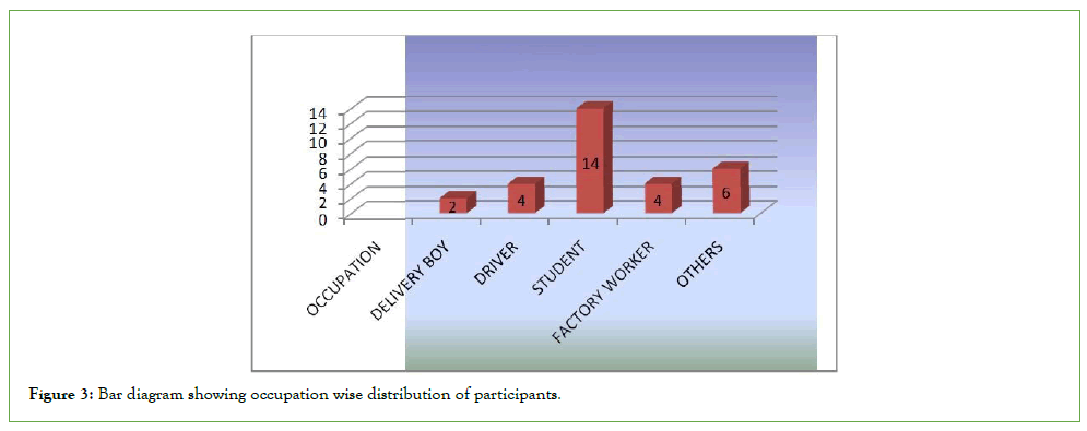 Occupation distribution: Among participants 2 (6.67%) were delivery boys, 4 (13.33%) were drivers, 14 (46.67%) were students, 4 (13.33%) were factory workers and 6 (20%) were of other occupations like shop keeper, tailor, carpenter, waiter and butcher (Figure 3).