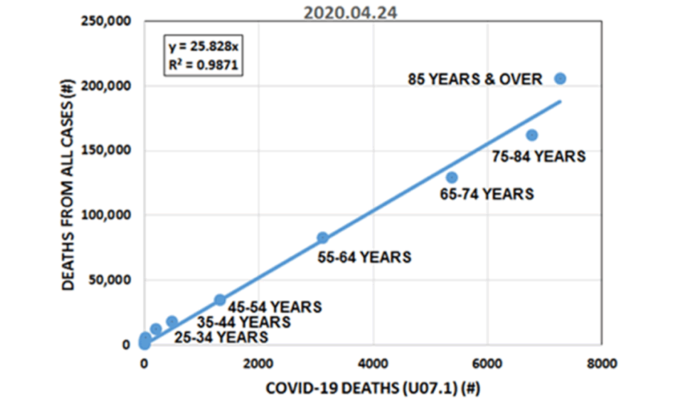 This is one of the first observations regarding the COVID pandemic: It is selective, targeting physically weakened individuals, elderly and sick. However the degree of correlation between the age and mortality risk is surprisingly strong (r2=0.98) (Figure 1).