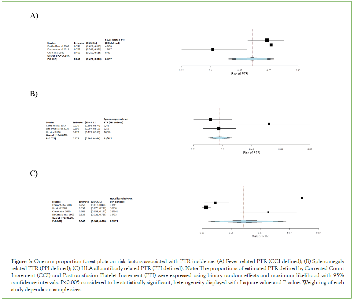 Figure 3: One-arm proportion forest plots on risk factors associated with PTR incidence. (A) Fever related PTR (CCI defined); (B) Splenomegaly related PTR (PPI defined); (C) HLA alloantibody related PTR (PPI defined). Note: The proportions of estimated PTR defined by Corrected Count Increment (CCI) and Posttransfusion Platelet Increment (PPI) were expressed using binary random effects and maximum likelihood with 95% confidence intervals. P<0.005 considered to be statistically significant, heterogeneity displayed with I square value and P value. Weighting of each study depends on sample sizes.