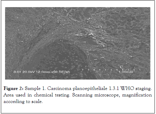 Figure 2. Sample 1. Carcinoma planoepitheliale 1.3.1 WHO staging. Area used in chemical testing. Scanning microscope, magnification according to scale.