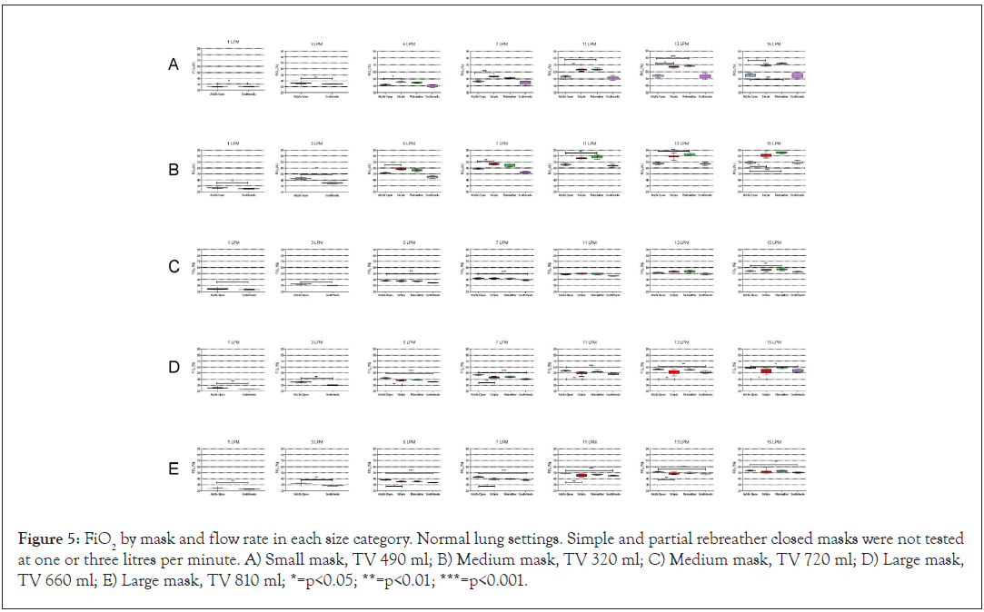 Figure 5: FiO2 by mask and flow rate in each size category. Normal lung settings. Simple and partial rebreather closed masks were not tested at one or three litres per minute. A) Small mask, TV 490 ml; B) Medium mask, TV 320 ml; C) Medium mask, TV 720 ml; D) Large mask, TV 660 ml; E) Large mask, TV 810 ml; *=p<0.05; **=p<0.01; ***=p<0.001.