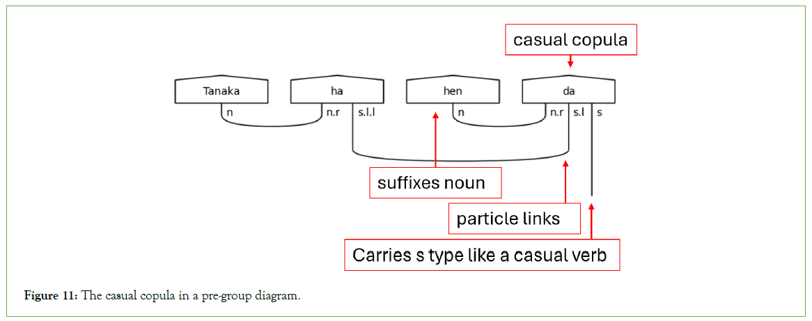 Next, the copula だ (da) is unique in that it must suffix a noun like a particle, hence the n.r type on the left side of the copula’s complex type in Figure 11. Otherwise, だ (da) functions like a verb.