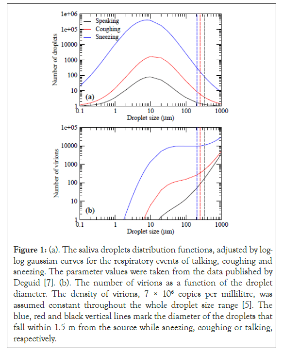 Furthermore, it is found that in a calm environment, the saliva droplets that fall within a distance of 1.5 m, are those with diameters less than 327 μm, 250 μm, and 202 μm emitted while speaking, coughing or sneezing, respectively. By inspecting Figure 1a, these results confirm that most of the droplets fall within the safe distance, recommended by the WHO authorities of 1.5 m. However, two points have to be raised: i) the aerosol droplets, with D<5 μm stay stationary around the source with a residence time that can be of hours or even days. These scenario changes in the presence of wind disturbances, which can transport them much farther. Good ventilation can move the droplets far away and disperse them, reducing thereby the risk. However, weak air currents can only extend the action range of the virus loaded droplets; ii) In the size distribution curves, a portion of droplets, with large sizes fall in a distance longer than 1.5 meters, prompting the question of how dangerous these droplets might be. To answer this question, it is necessary to estimate the viral load of the droplets as a function of their size and combine that information with the size distribution. Virological testing using Reverse Transcription Polymerase Chain Reaction (RT-PCR) found, in saliva samples of sick persons, an average viral load of 7 × 106 copies per milliliter [5]. Thus, to estimate the number of virions expelled in the respiratory events, we calculate from Figure 1a, the volume associated to the number of droplets for each size and multiply them by the average viral density.